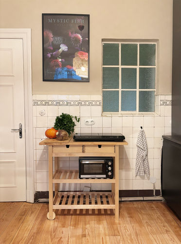 Das Atelier (65 m²) wiederum besticht mit klassischem Altbaucharme: Dielenboden, originale Hamburger Fliesen in der Küche und bemalte Wände, die ihm eine künstlerische Note verleihen. Durch die Nordwestausrichtung fällt am Nachmittag warmes Licht in die Räume – ein Ort voller Atmosphäre und Charakter.